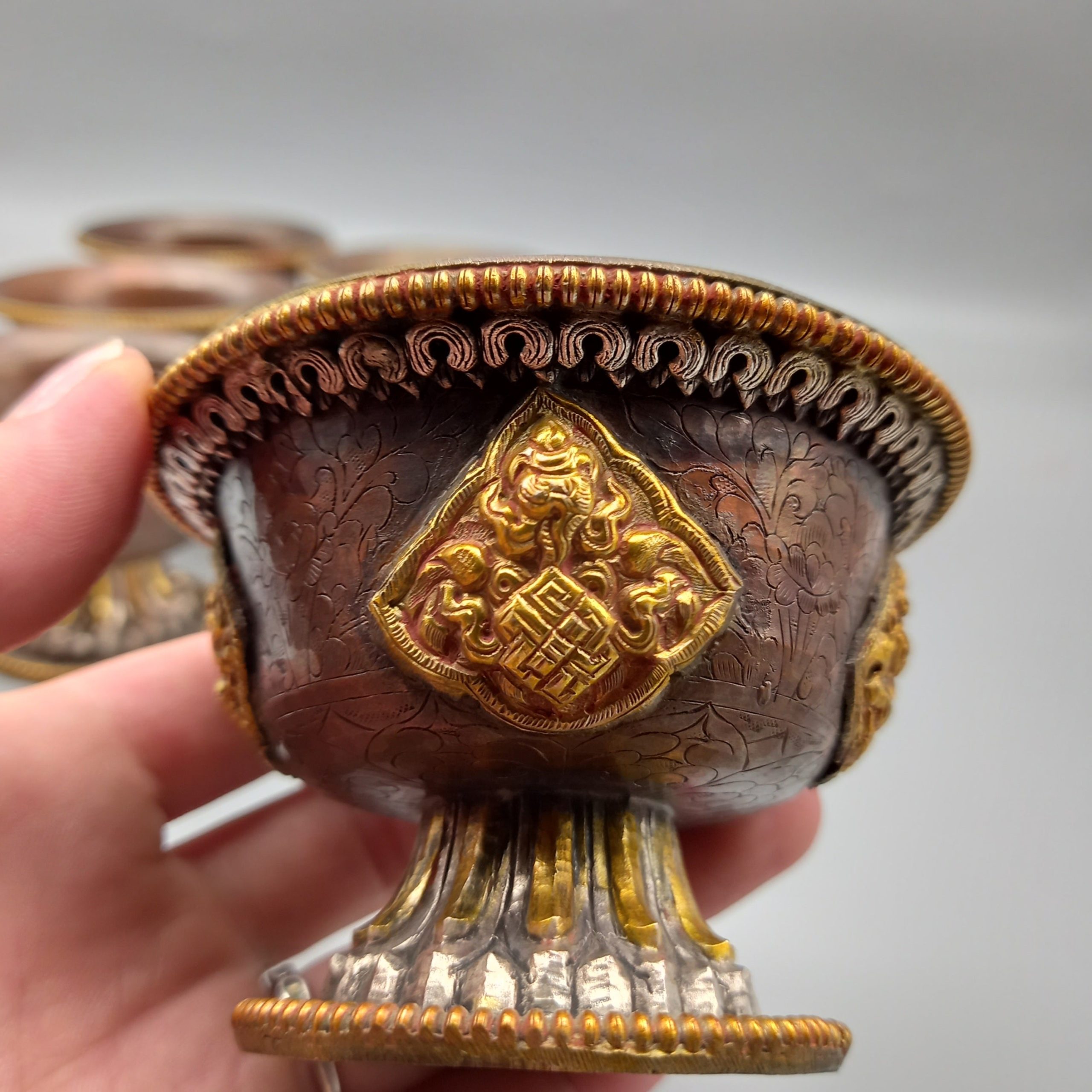 This Offering bowls is made of from copper alloy gold and silver plated with find hand carved with beautiful images. The carving details are done very finely. This finely hand crafted Offering bowls by the master artisans of Patan, Nepal.