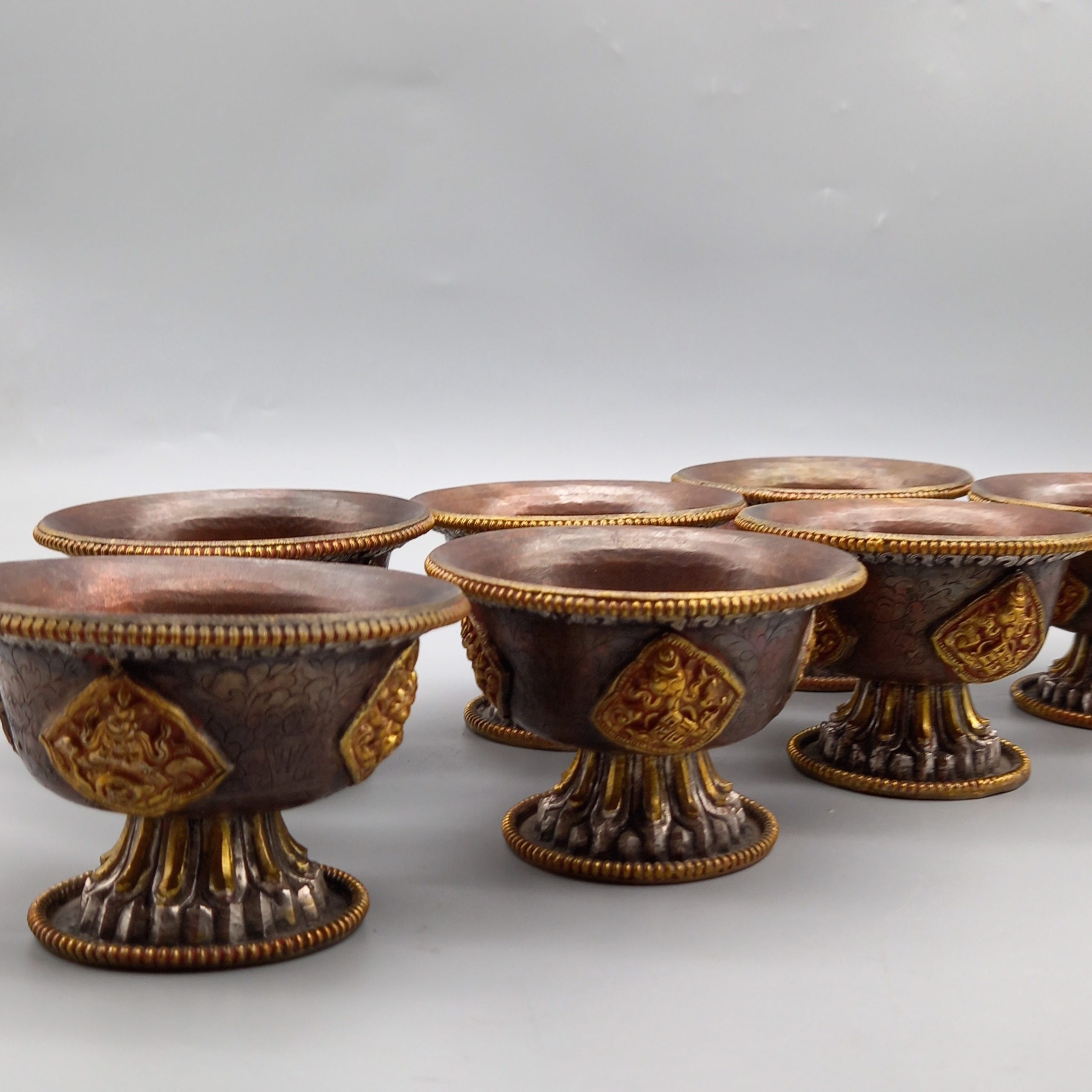 Offering bowls are an essential part of any Tibetan Buddhist shrine. Available in a set of seven, these bowls may be used for offering pure water, the eight sensory objects, the five commitment substances, and so forth.