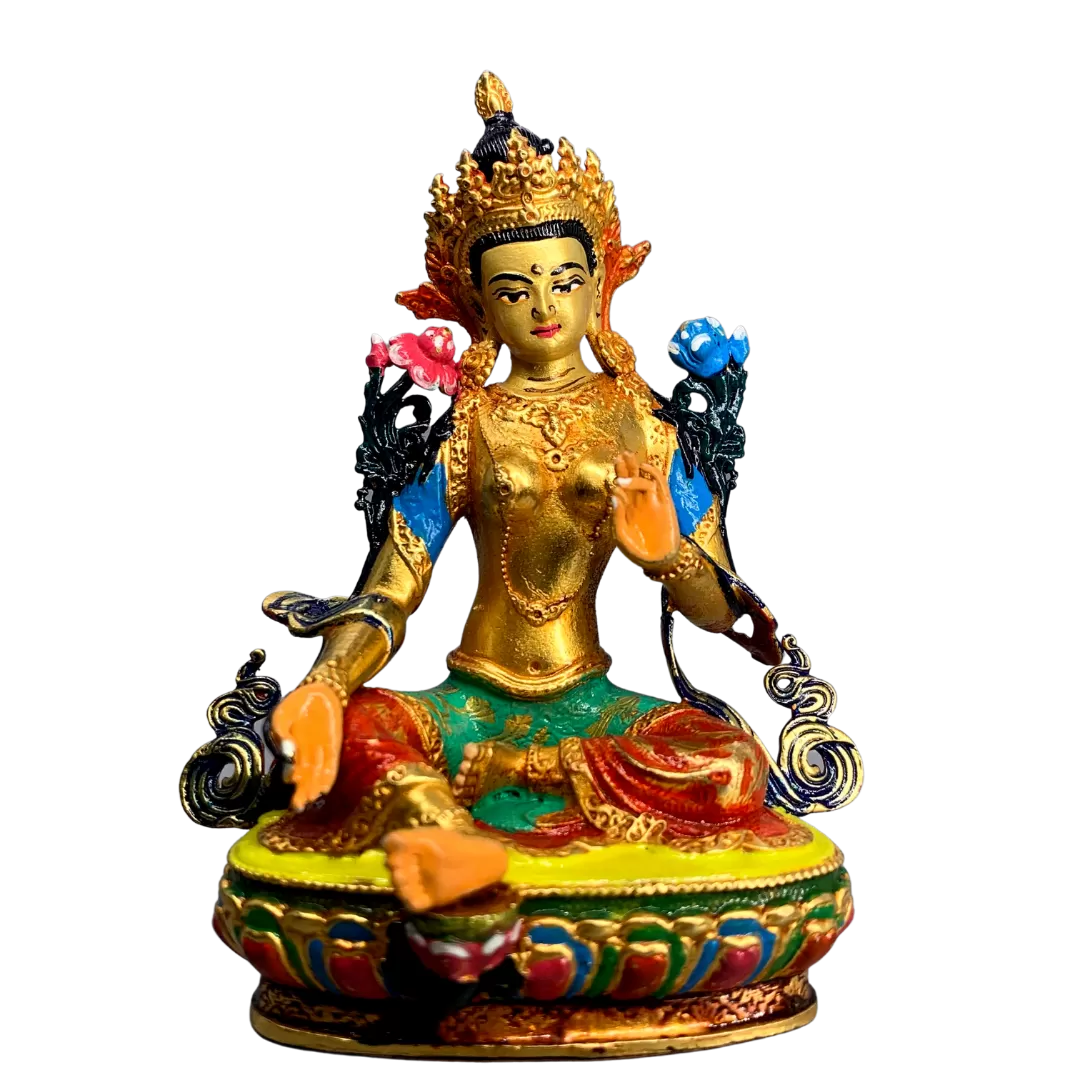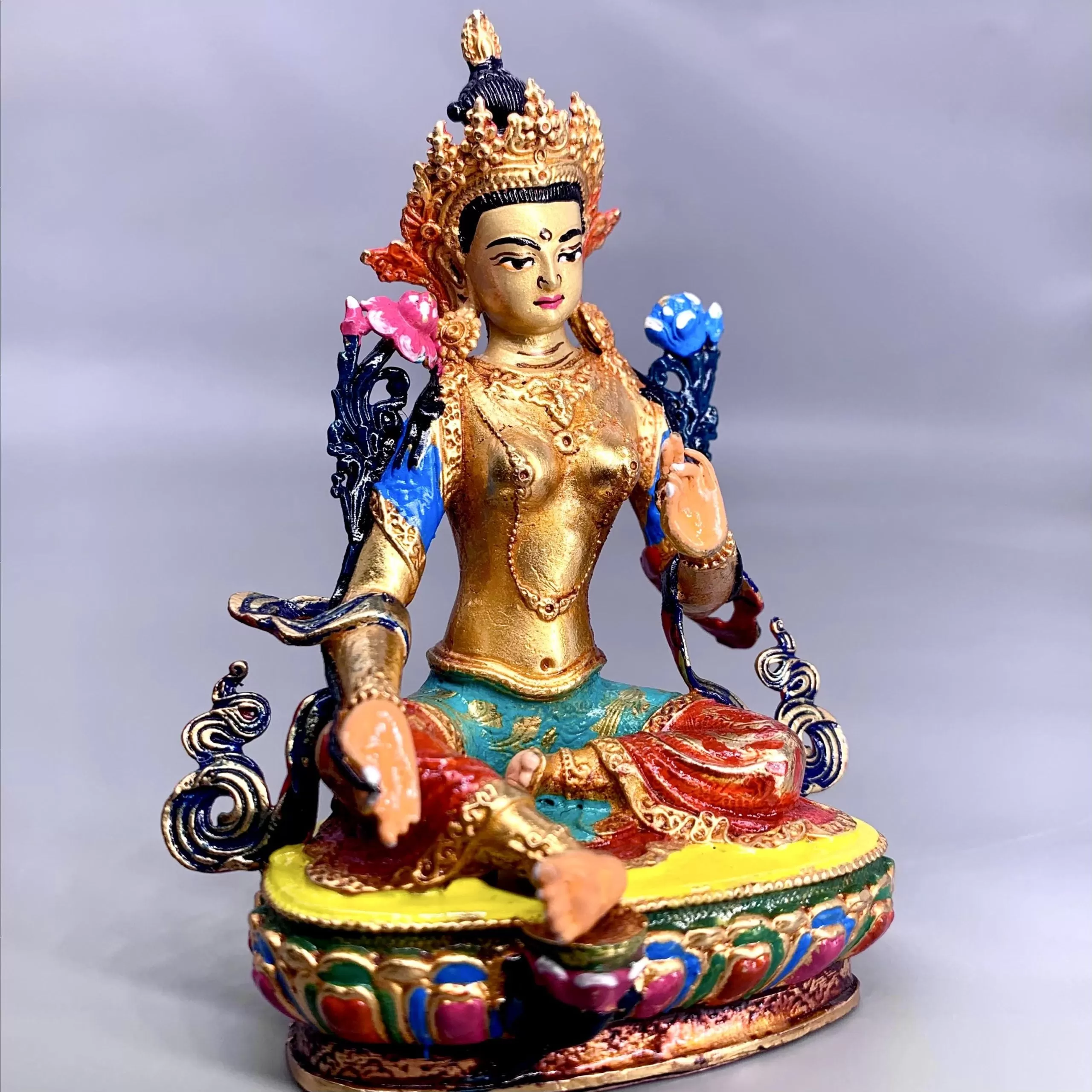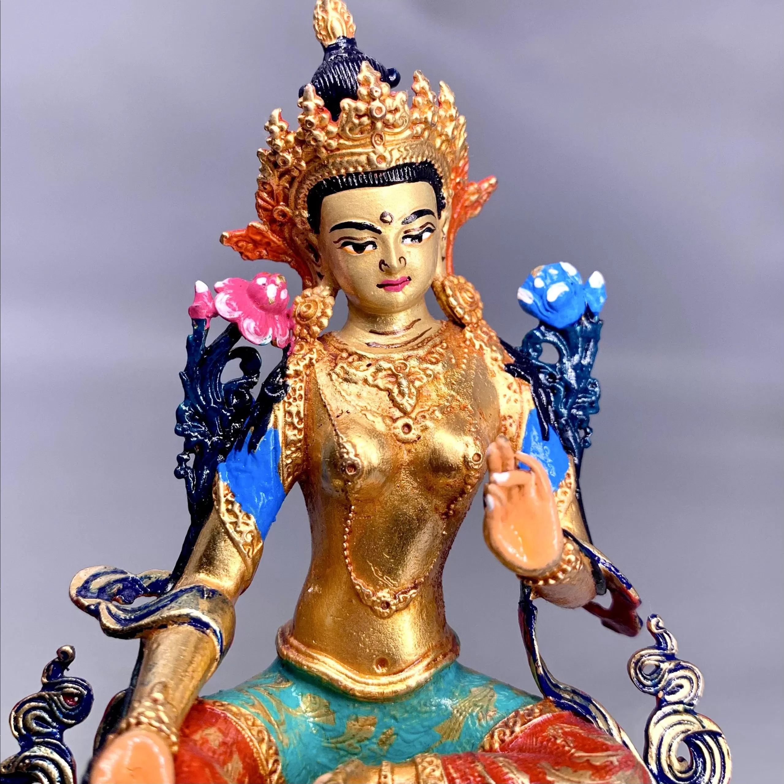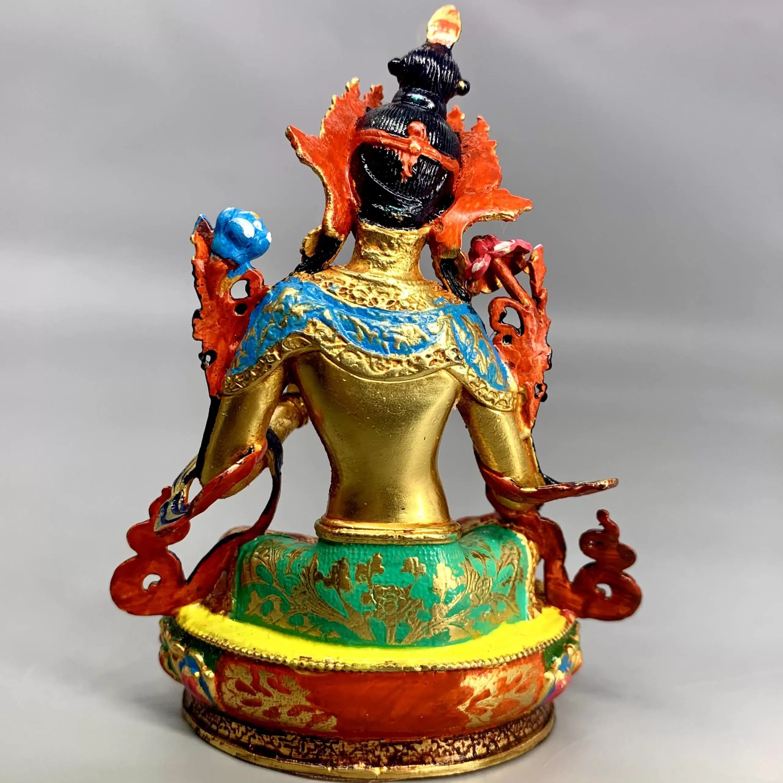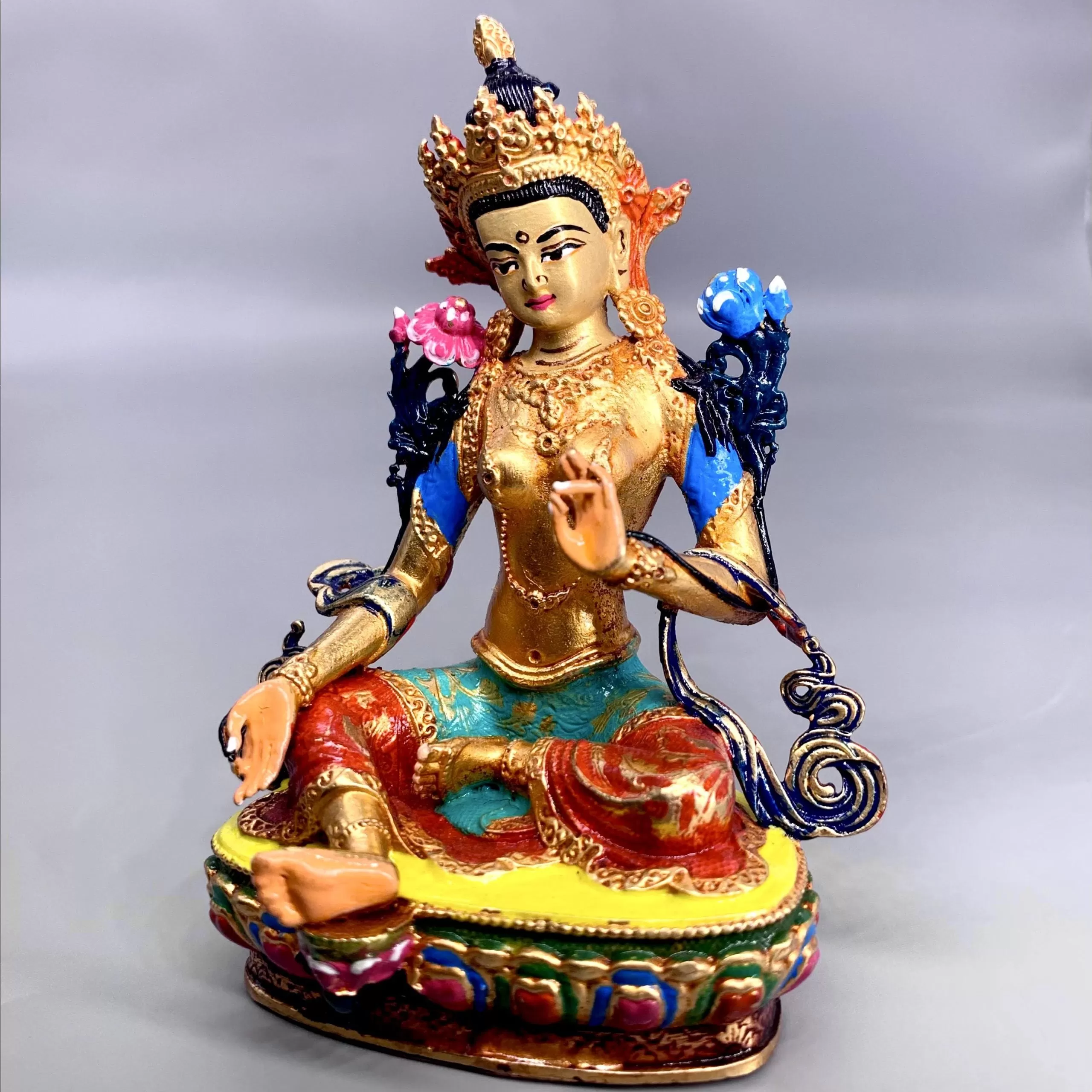 Green Tara Statue. This statue is a hand painted. The robe of the statue is hand painted with unique embossed painting style.