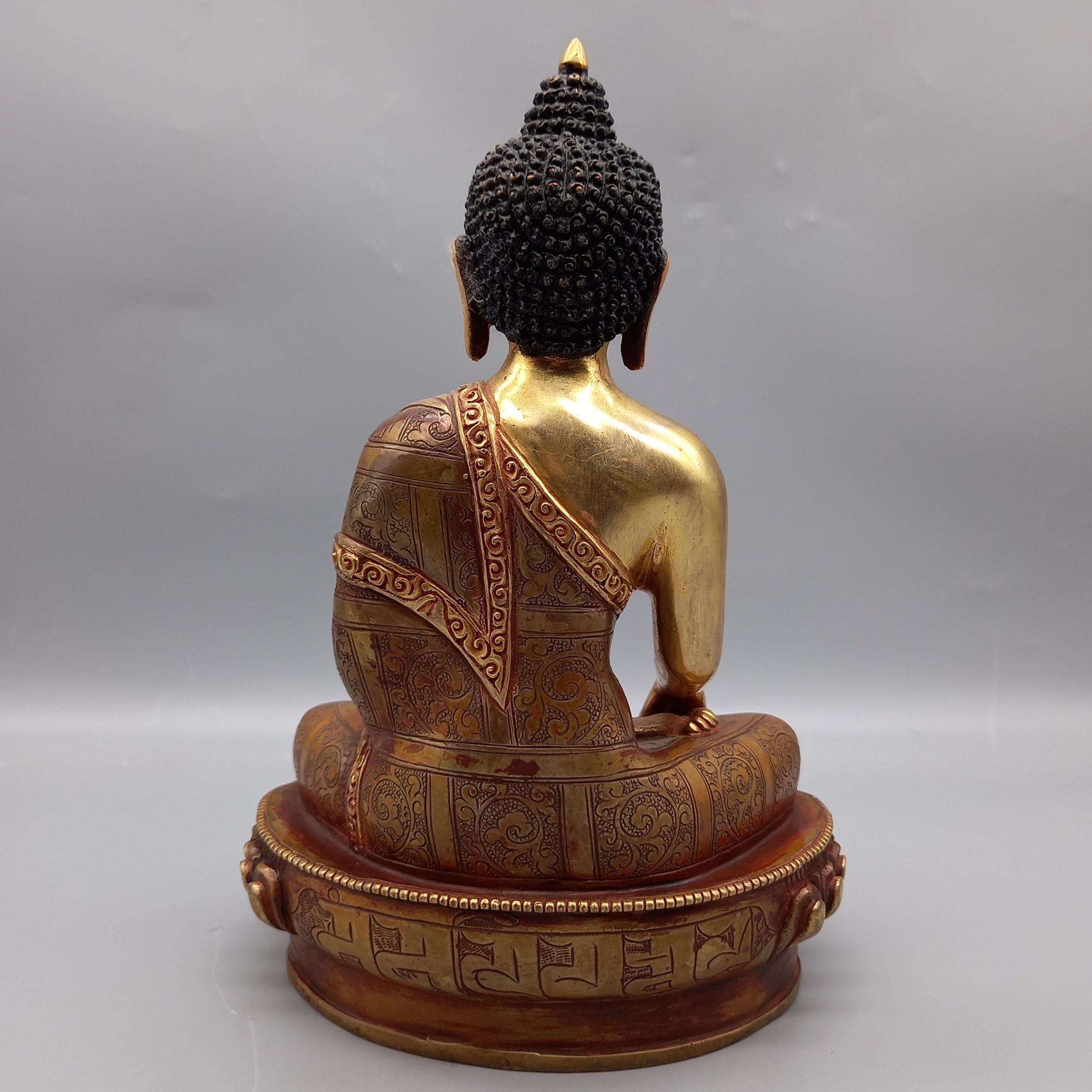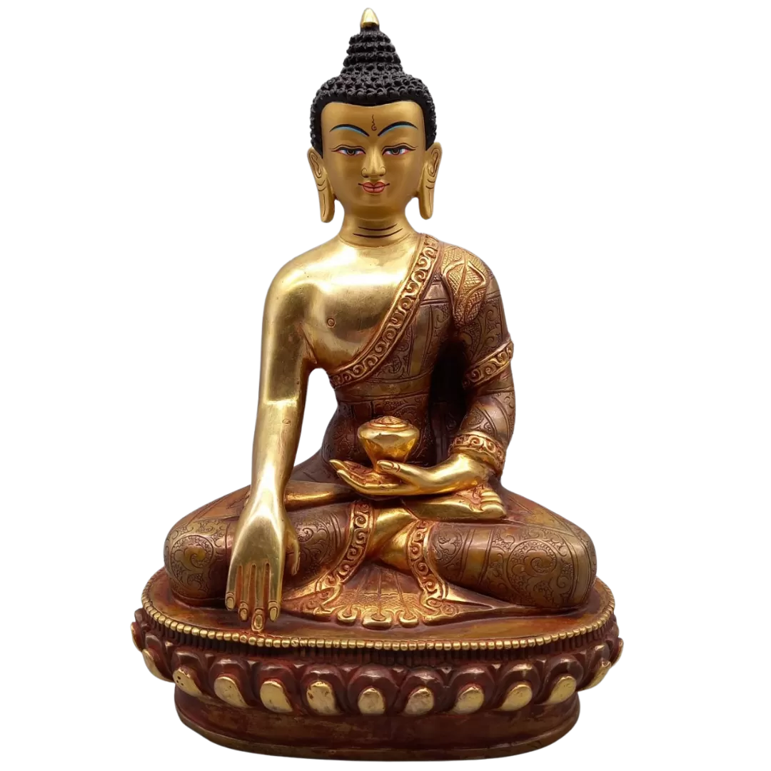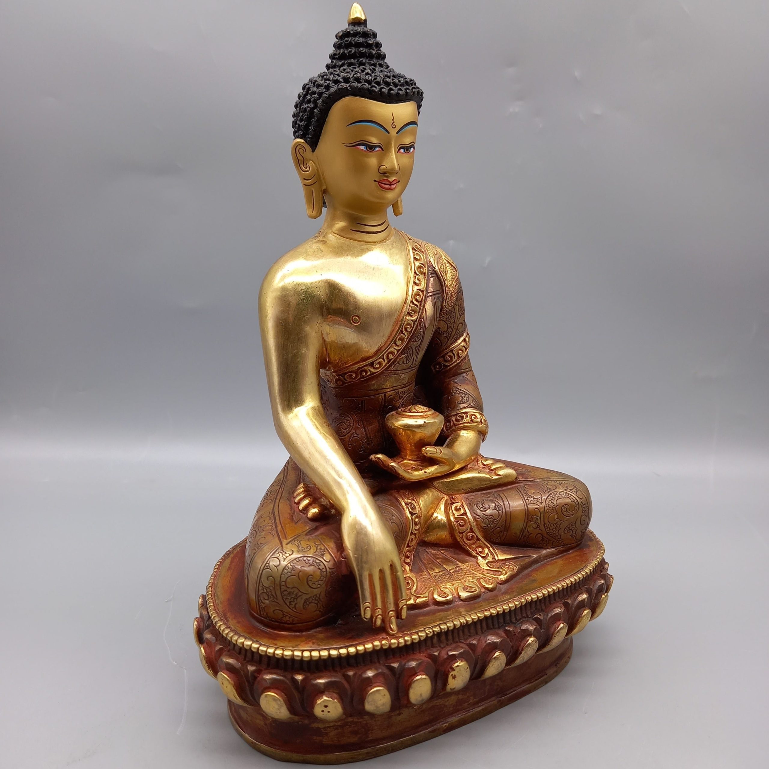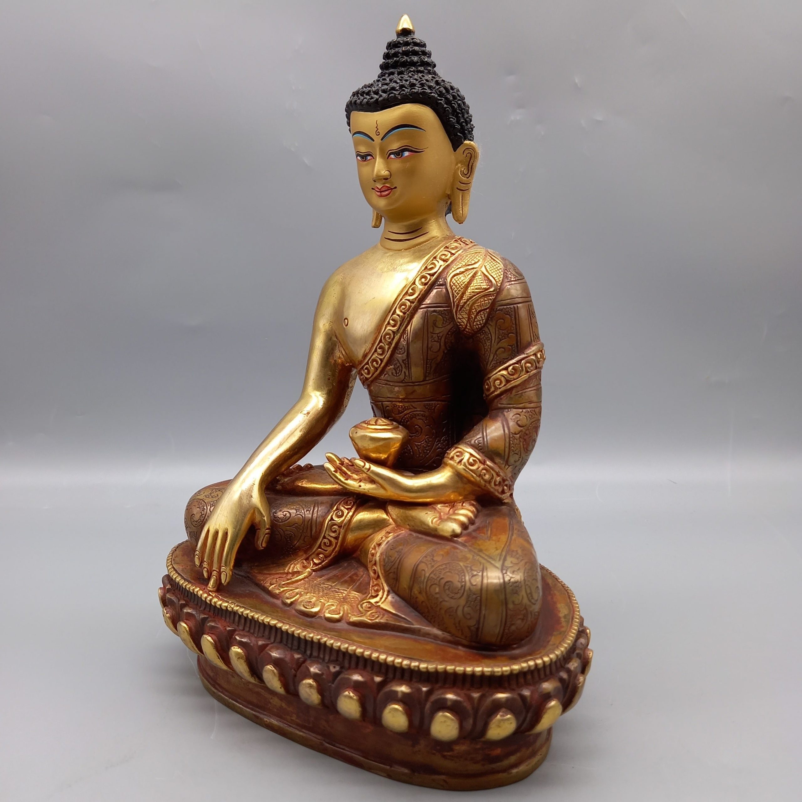Expertly cast from copper alloy and gilded with 24 karat gold, this sculpture is a profoundly moving representation of Buddha Shakyamuni. He sits majestically upon a single lotus throne, his head slightly bowed, smiling softly in sublime meditation. His monastic robes drape beautifully across his shoulder and arm and are exquisitely detailed throughout the statue. This sculpture was individually handcrafted in Patan, Nepal by master artisans of the Shakya clan who are considered among the best in the world. These craftsmen are the modern heirs to a centuries-old tradition of creating sacred art for use in temples and monasteries. The fine metalworking techniques have been passed down from generation to generation since ancient times.