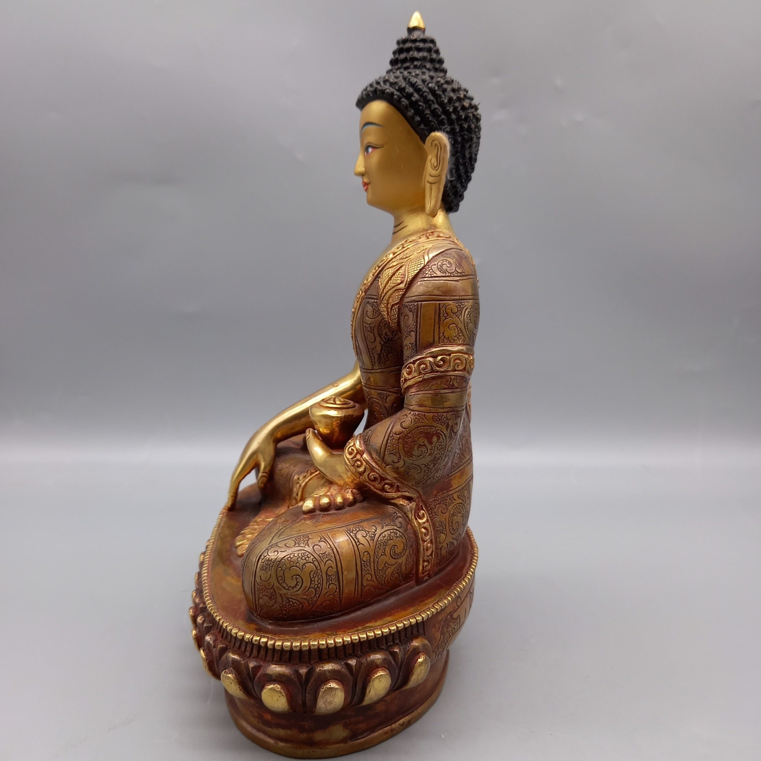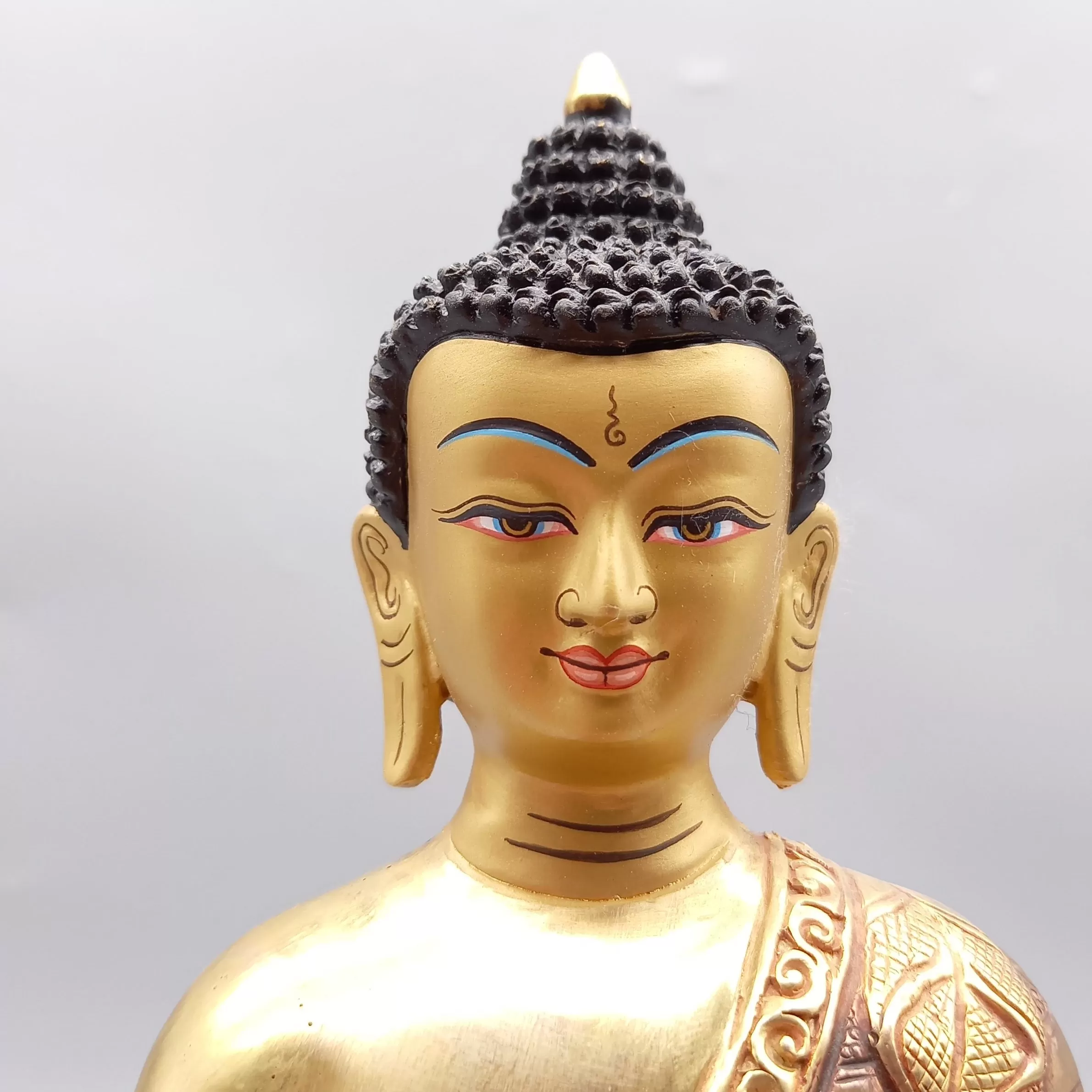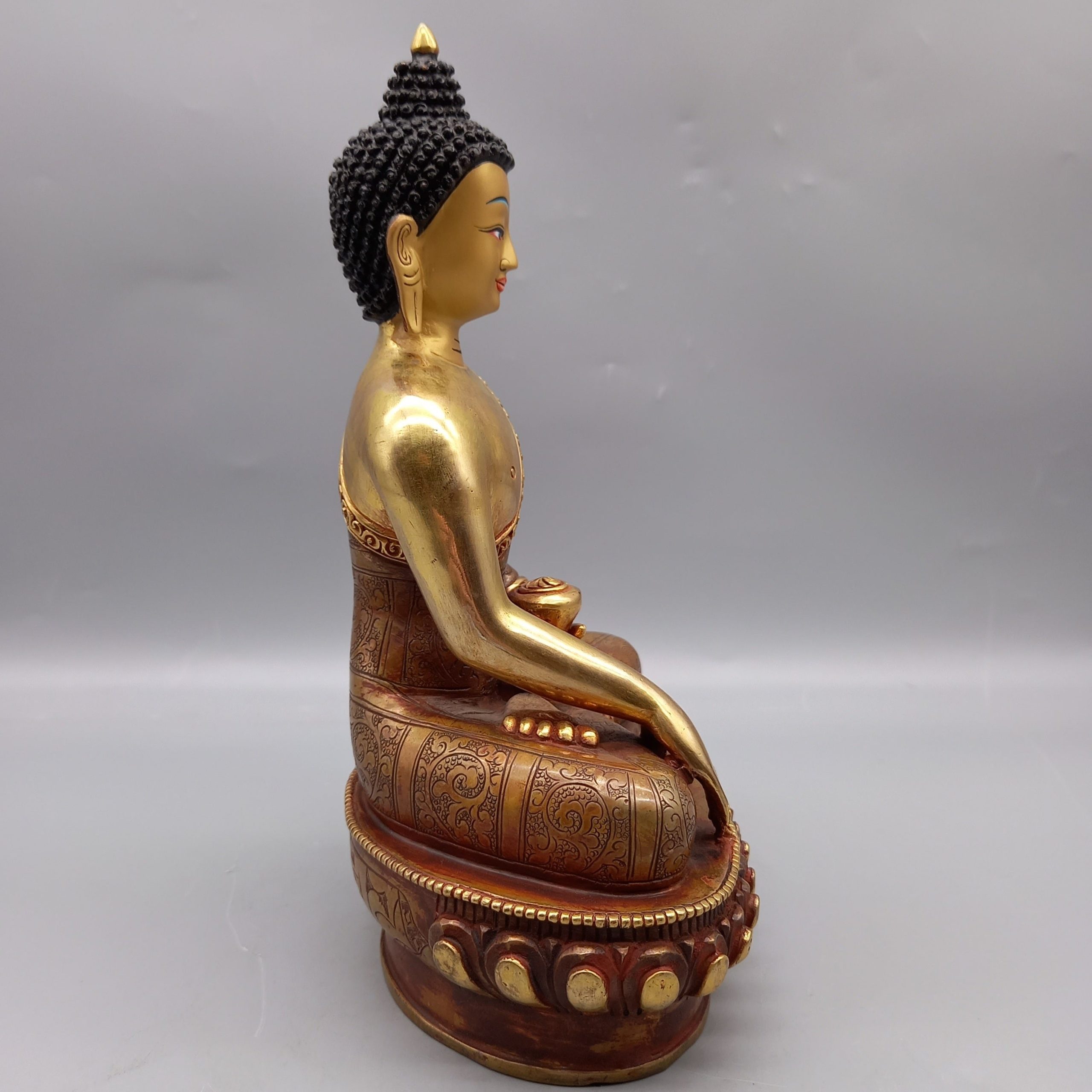 Expertly cast from copper alloy and gilded with 24 karat gold, this sculpture is a profoundly moving representation of Buddha Shakyamuni. He sits majestically upon a single lotus throne, his head slightly bowed, smiling softly in sublime meditation. His monastic robes drape beautifully across his shoulder and arm and are exquisitely detailed throughout the statue. This sculpture was individually handcrafted in Patan, Nepal by master artisans of the Shakya clan who are considered among the best in the world. These craftsmen are the modern heirs to a centuries-old tradition of creating sacred art for use in temples and monasteries. The fine metalworking techniques have been passed down from generation to generation since ancient times.
