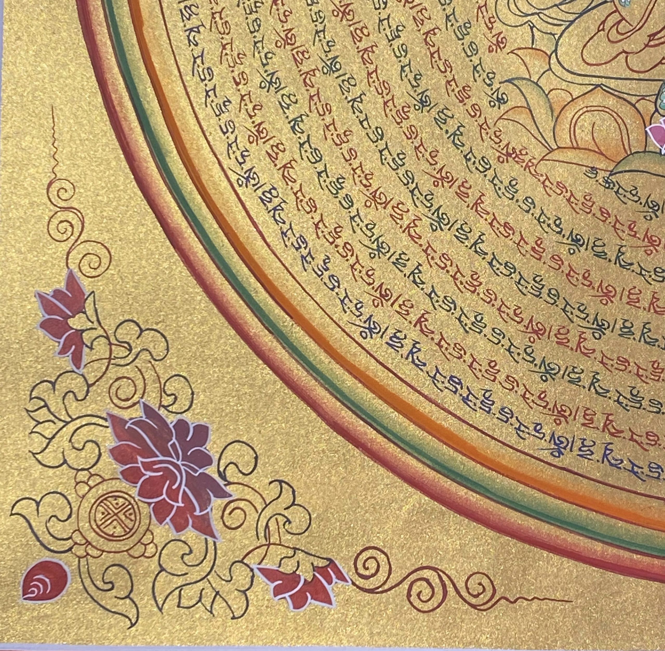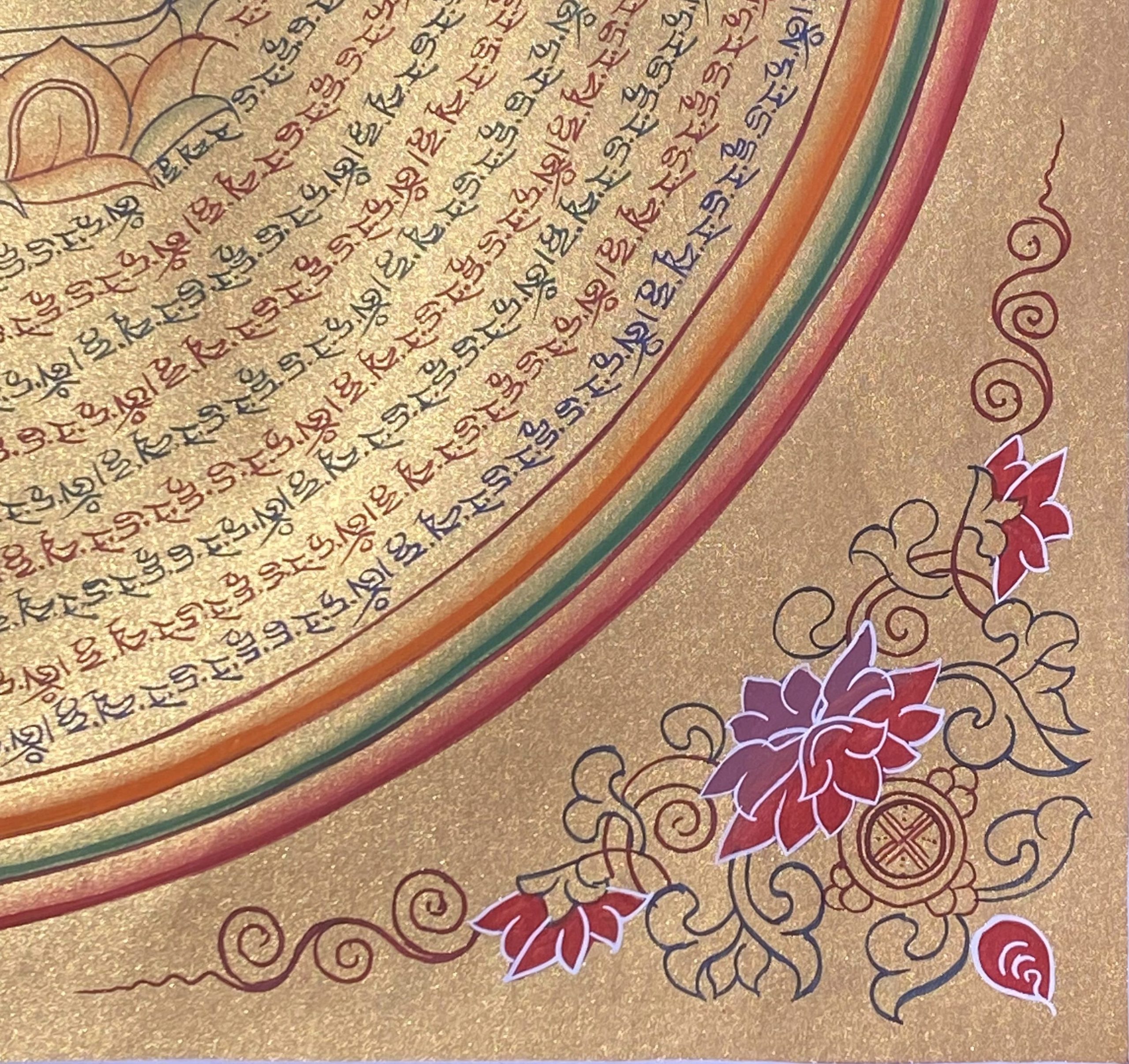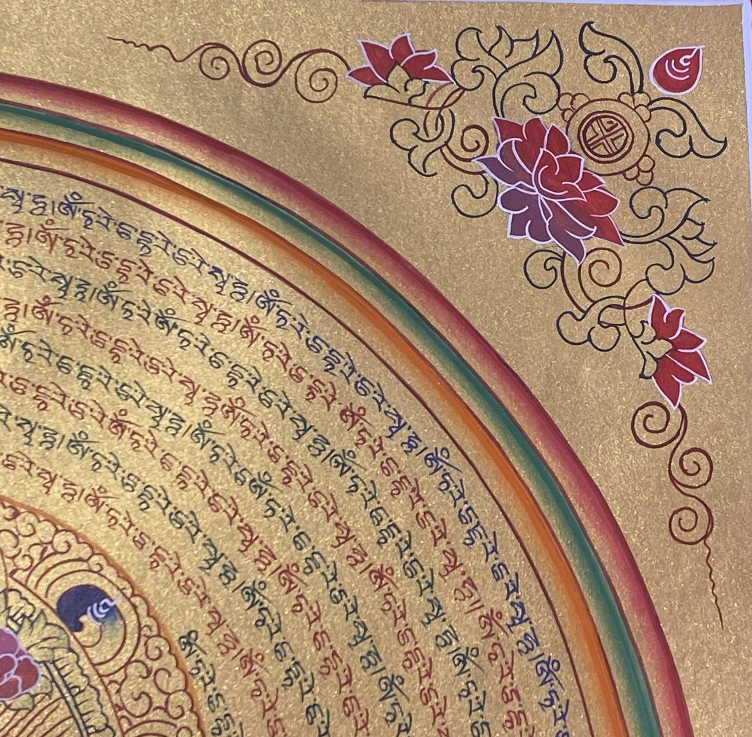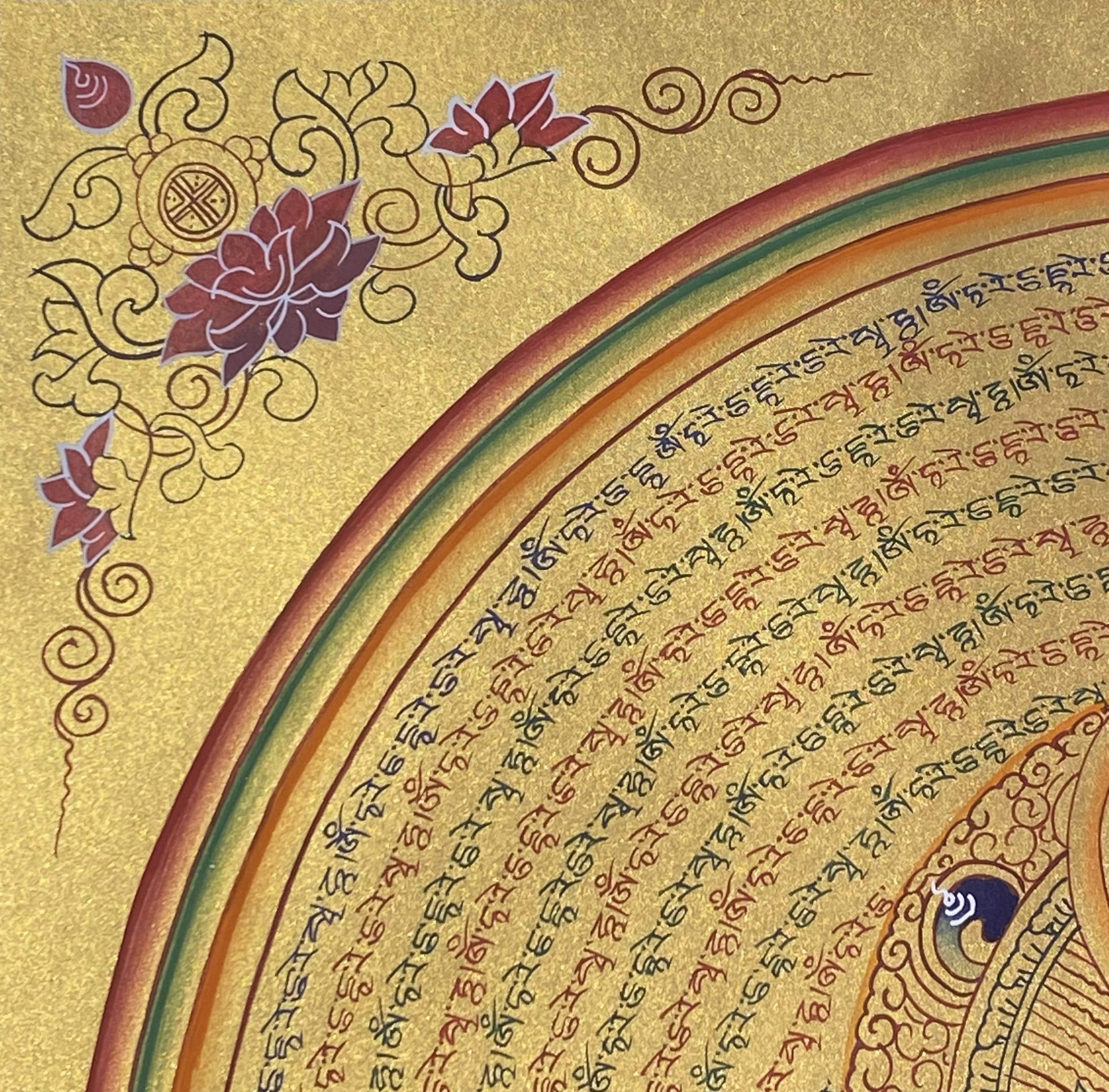 Circles of Mantras: The concentric golden rings consist of the hand-scripted sacred mantra: