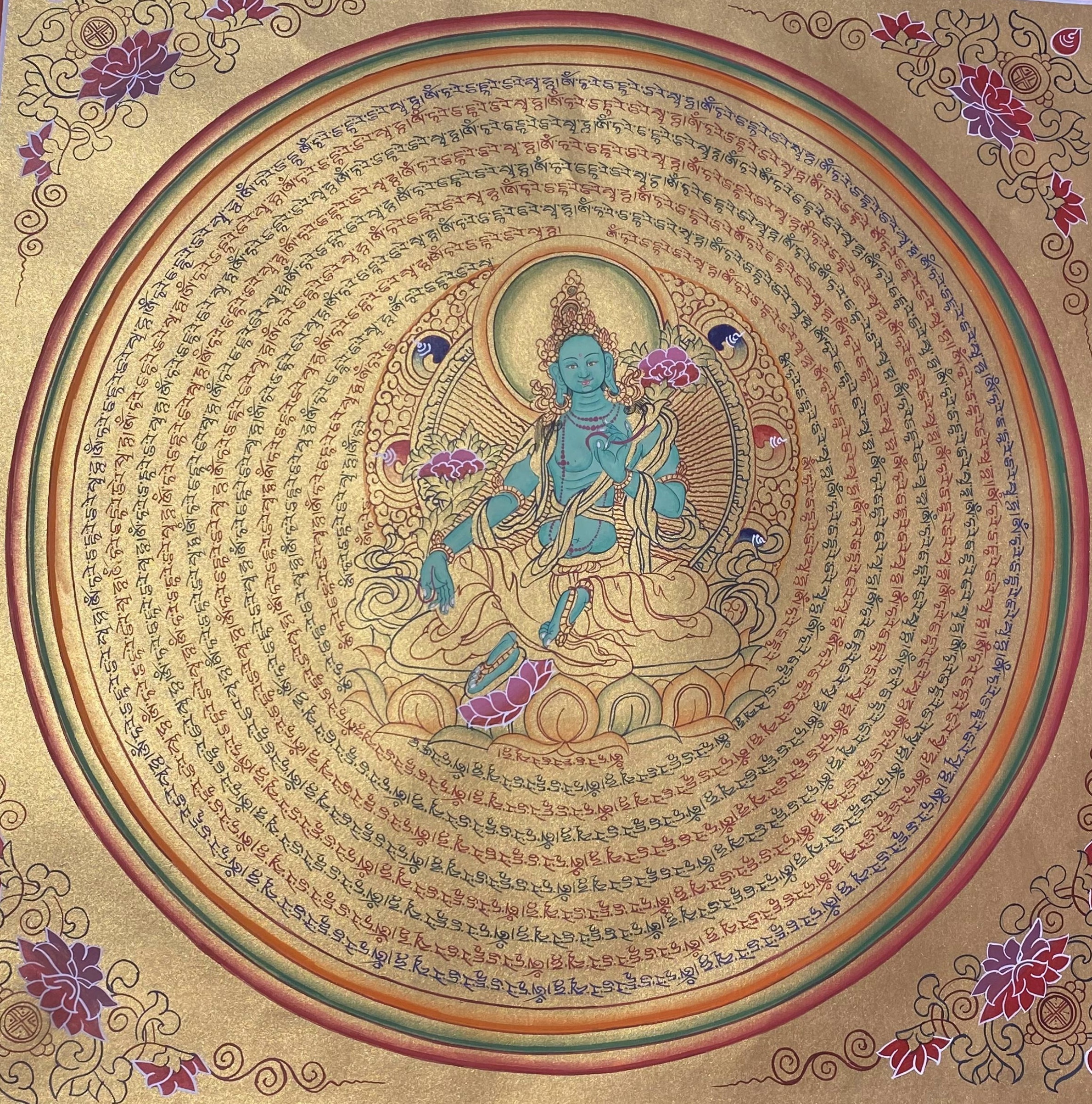 The Center: At the heart lies Green Tara, the “Mother of Liberation.” Seated with one foot stepping forward, she is always ready to jump in and help those in need. She holds a beautiful blue lotus flower, representing her pure heart and her power to overcome any problem with ease.