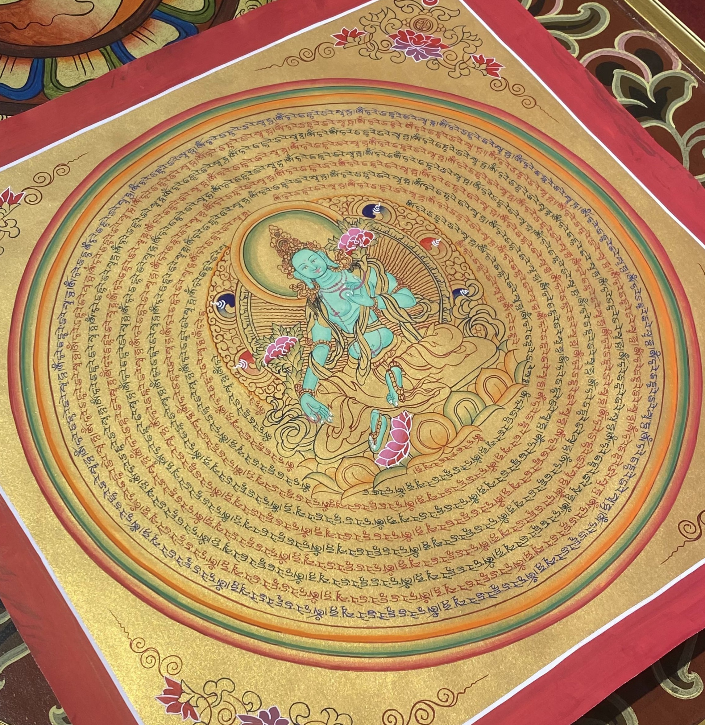 Exquisite hand-painted Thangka featuring sacred mantras in real gold on a white canvas. A powerful symbol of spiritual purity, harmony, and protection for your sacred space. This unique masterpiece serves as a bridge between ancient tradition and modern elegance, inviting the swift, compassionate energy of Green Tara into your daily life.