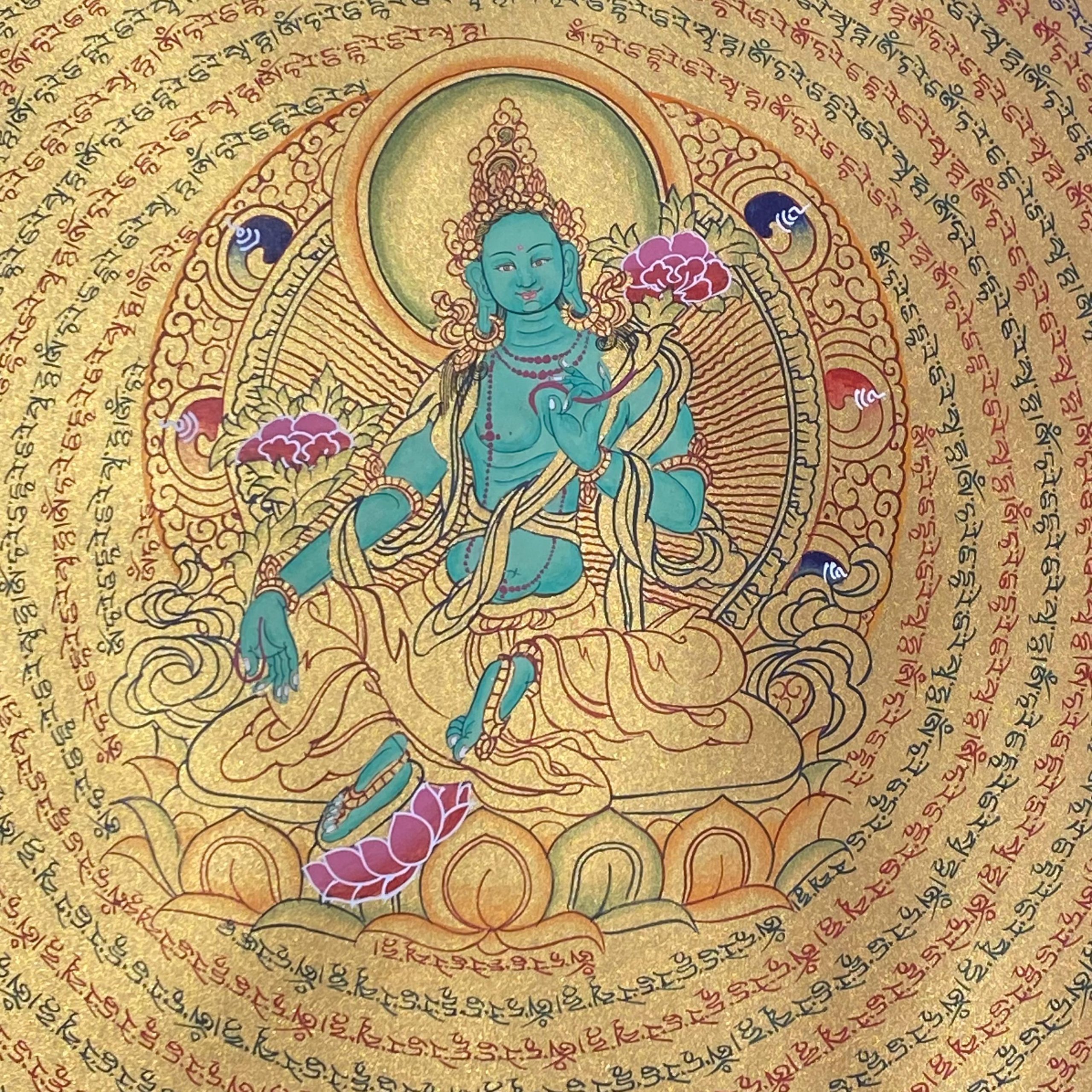 Exquisite hand-painted Green Tara Thangka featuring sacred mantras in real gold on a white canvas. A powerful symbol of spiritual purity, active kindness, and protection for your sacred space.