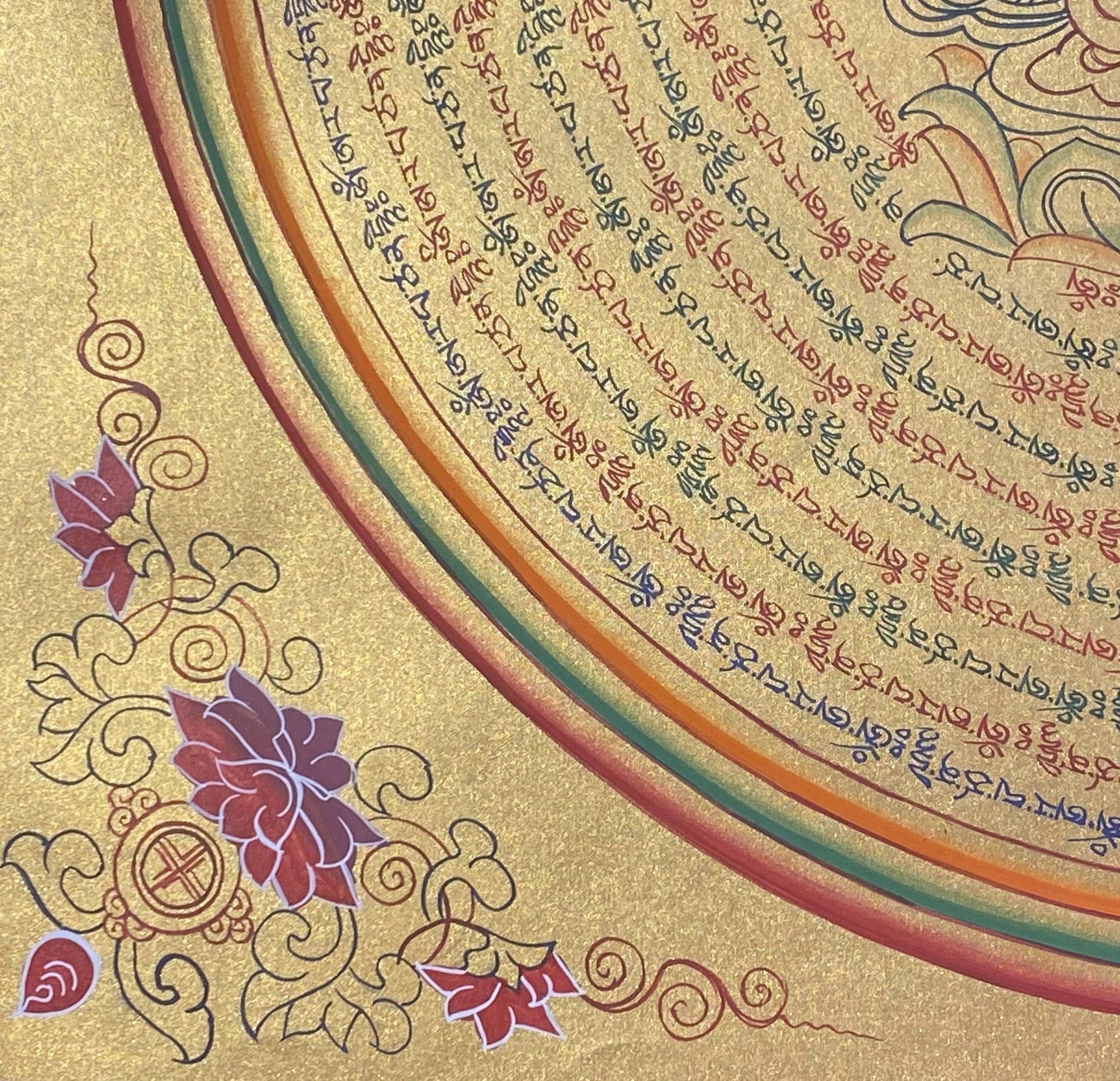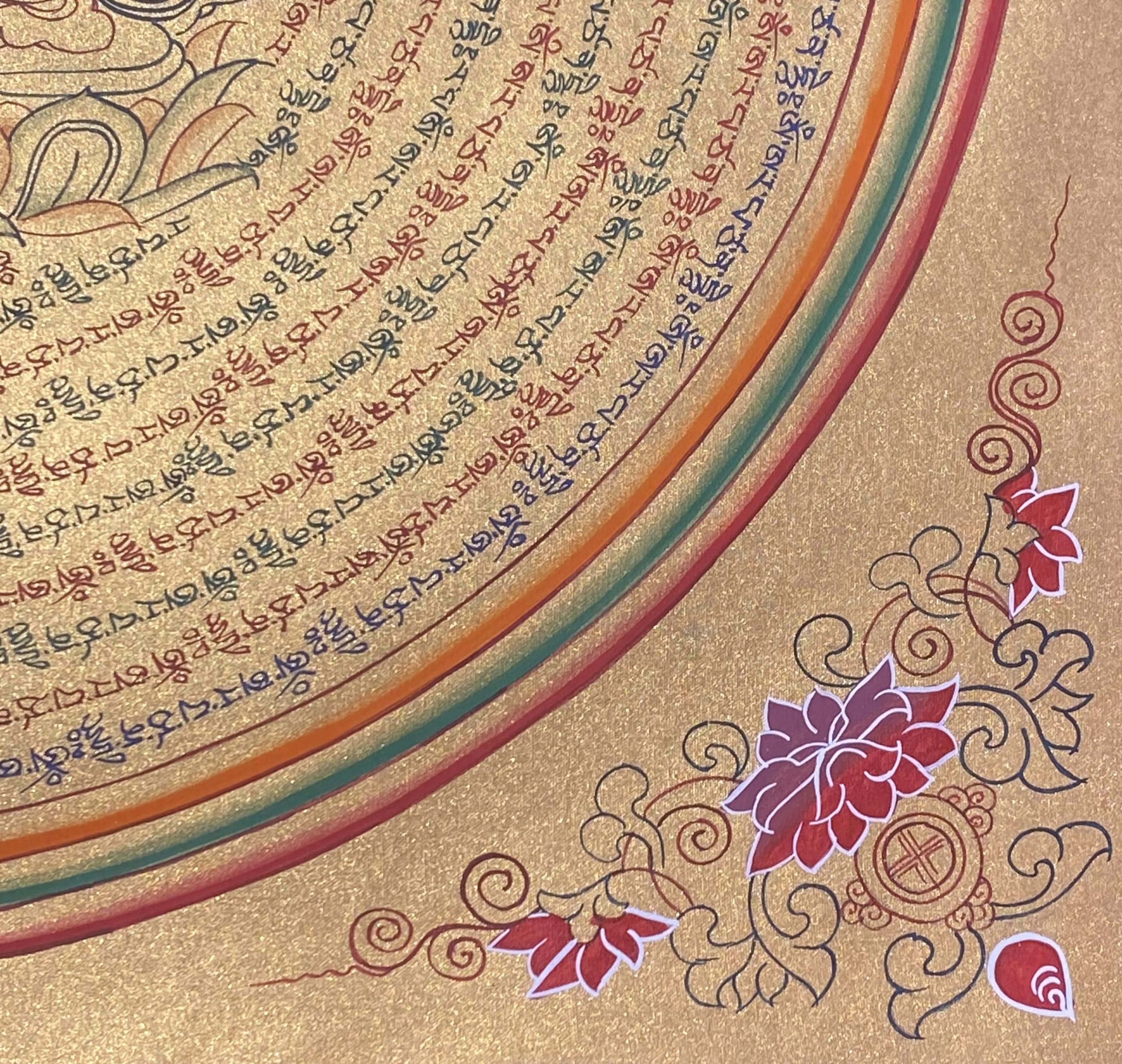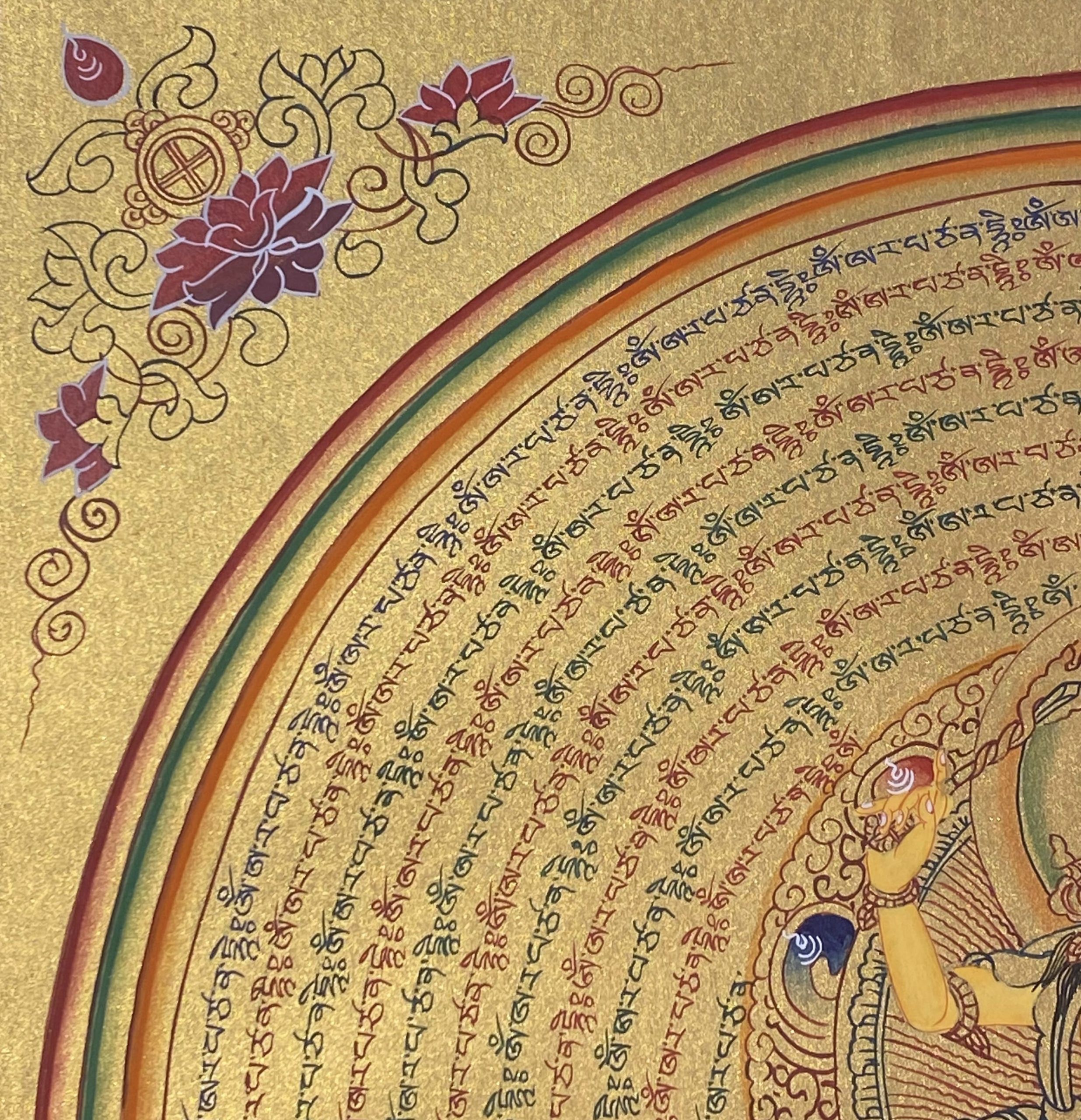 Circles of Mantras: The concentric golden rings consist of his hand-scripted sacred mantra: Om Ah Ra Pa Tsa Na Dhi . These mantras radiate outward, creating a protective shield, sharpening the intellect, and purifying the energy of the environment.