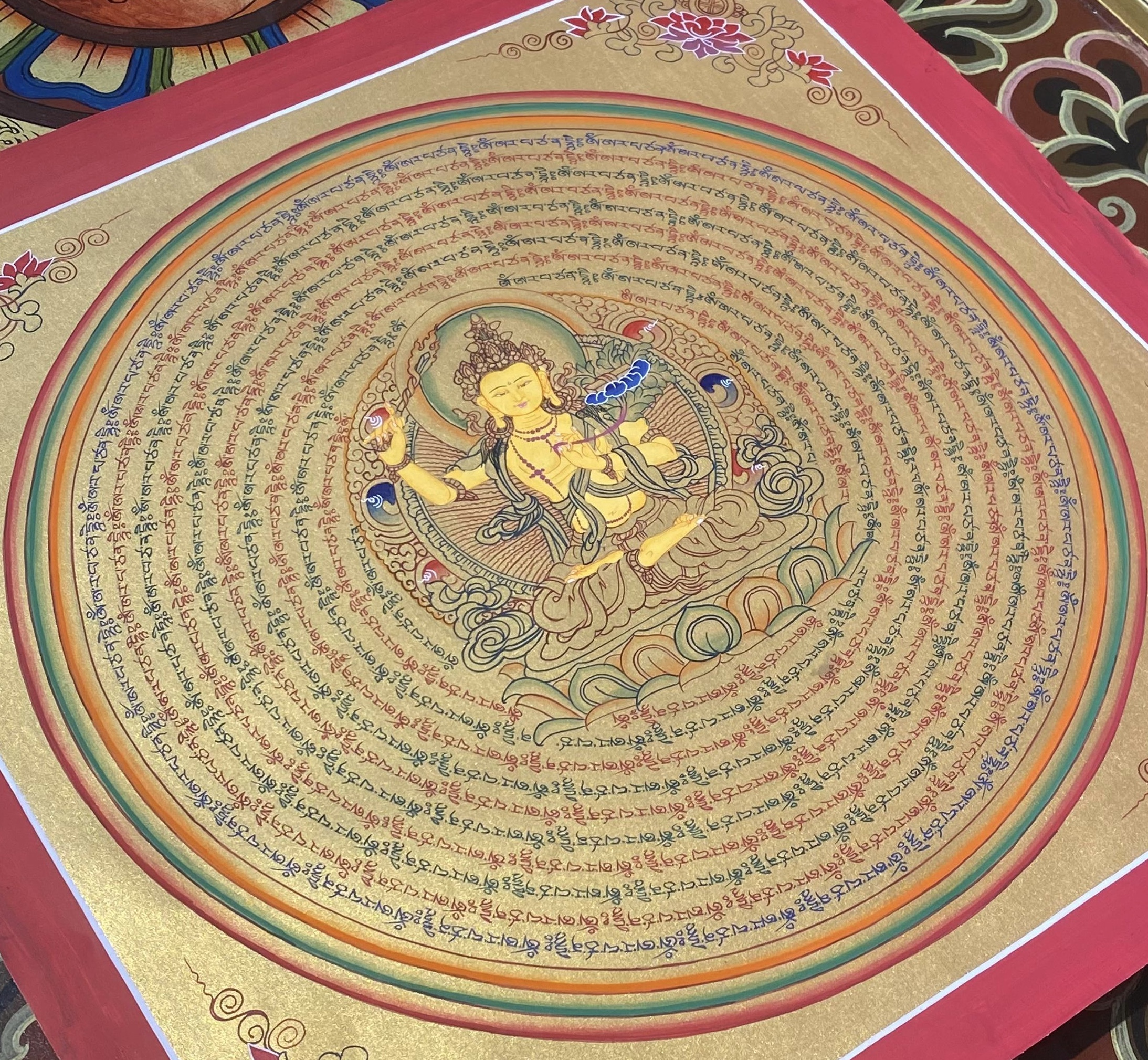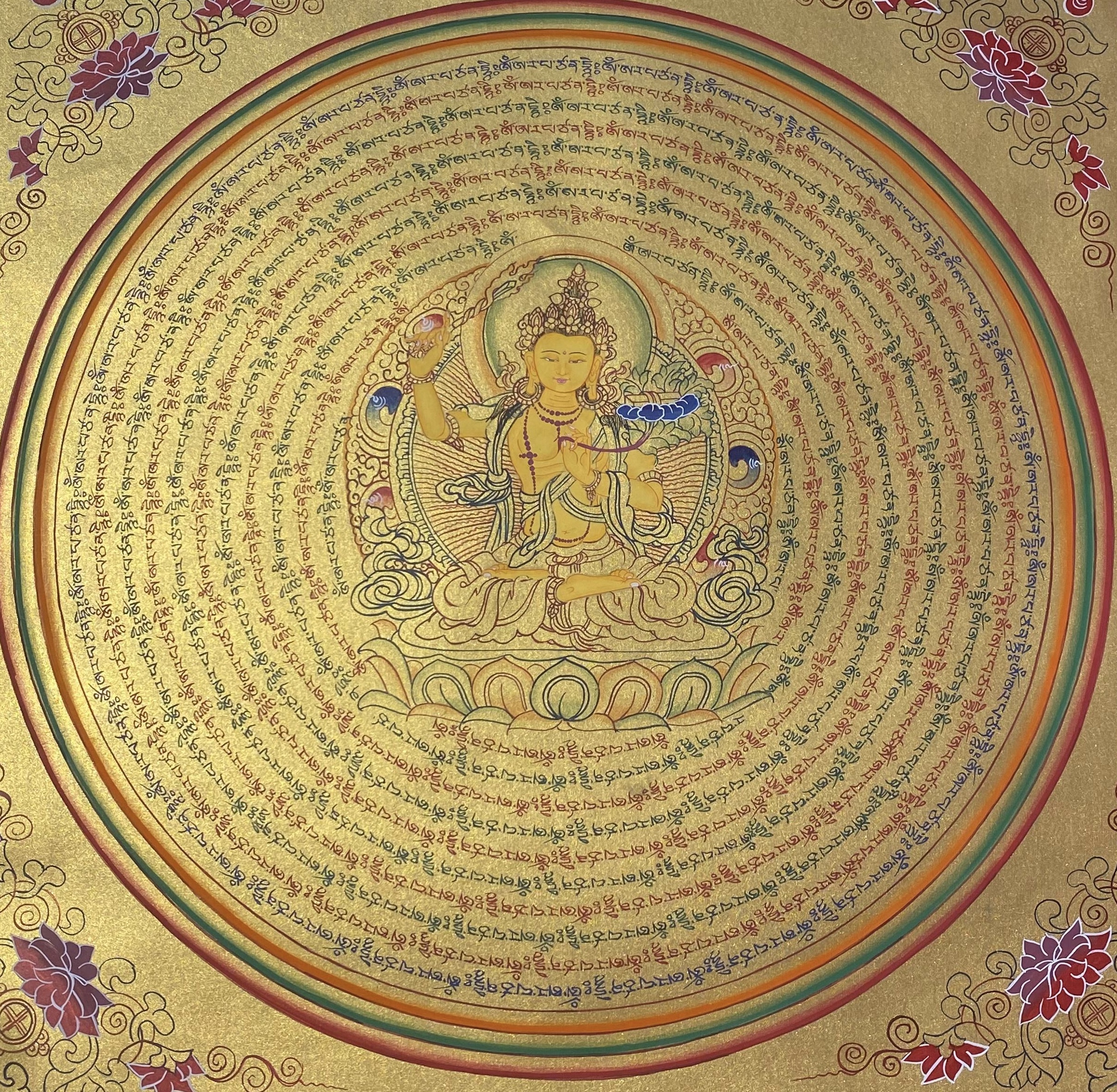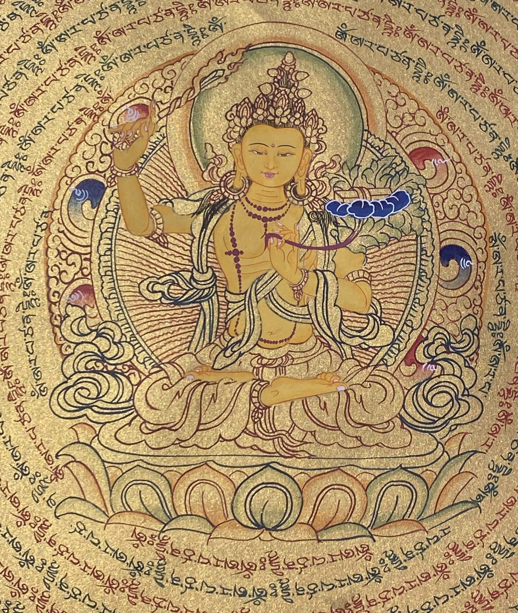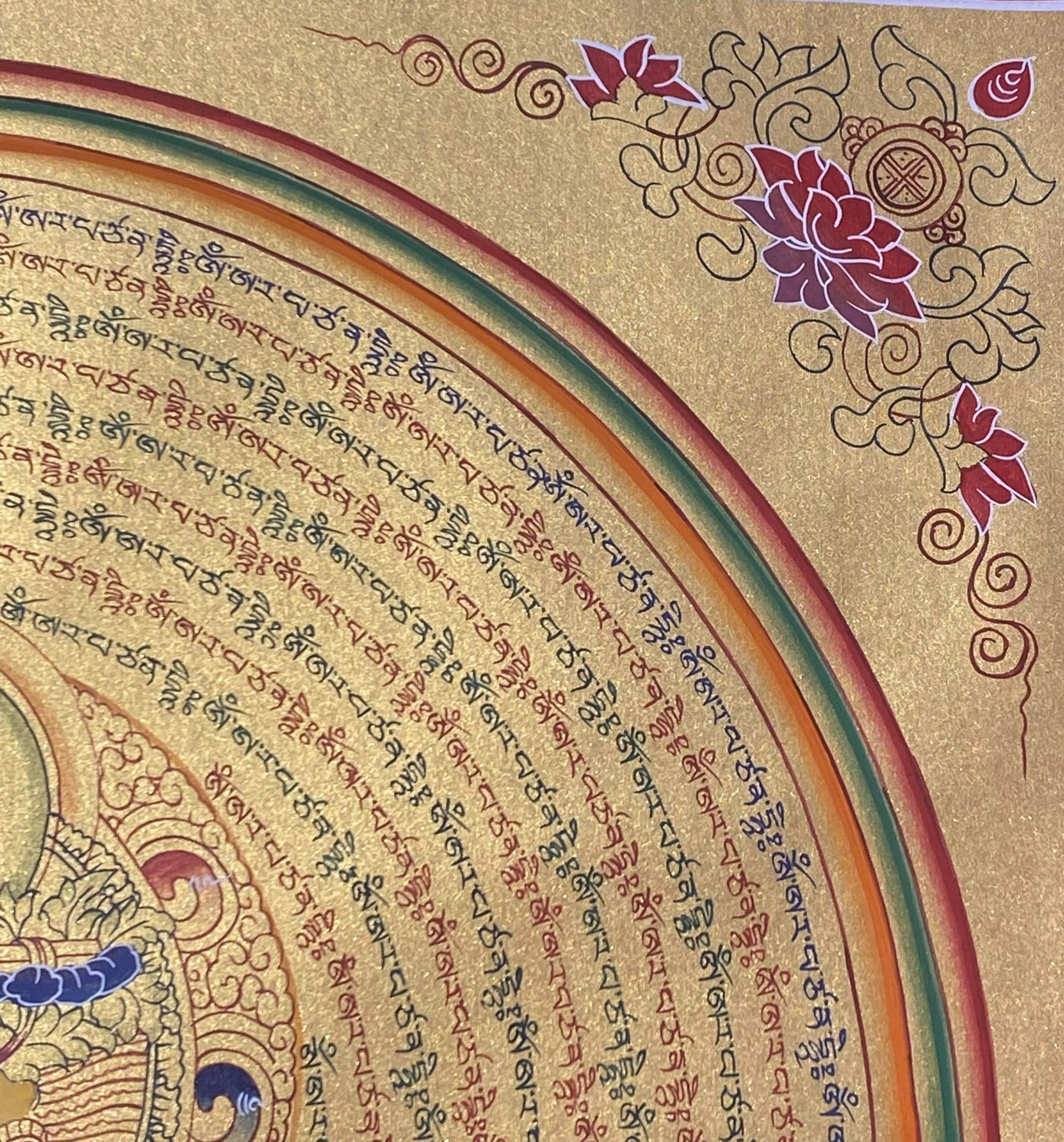 Circles of Mantras: The concentric golden rings consist of his hand-scripted sacred mantra: Om Ah Ra Pa Tsa Na Dhi . These mantras radiate outward, creating a protective shield, sharpening the intellect, and purifying the energy of the environment.